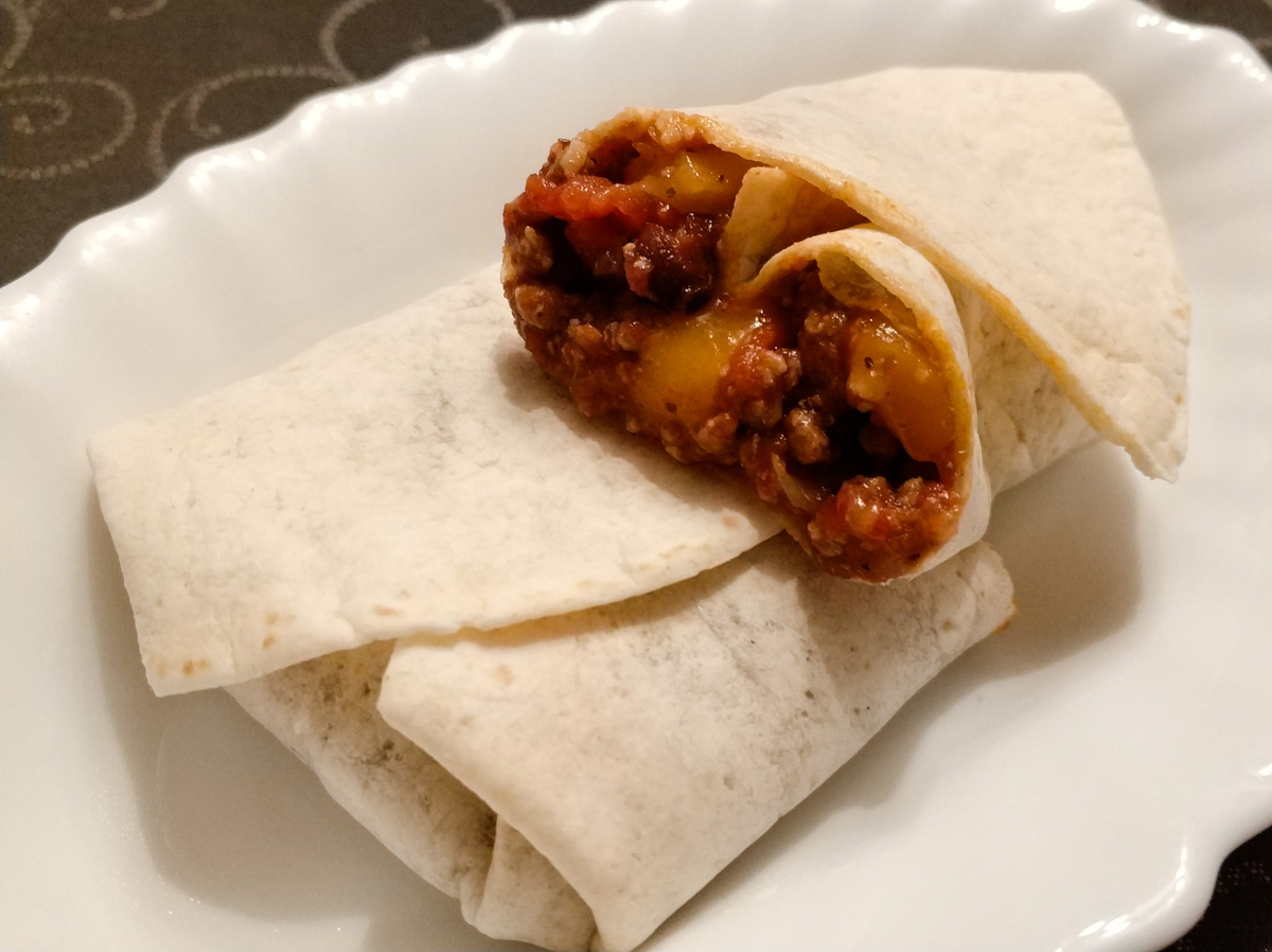 El chili con carne está muy bueno con unos nachos con su queso, su picadillo y sus cosas, pero también es un gran material para hacerse unos burritos improvisados como éstos: