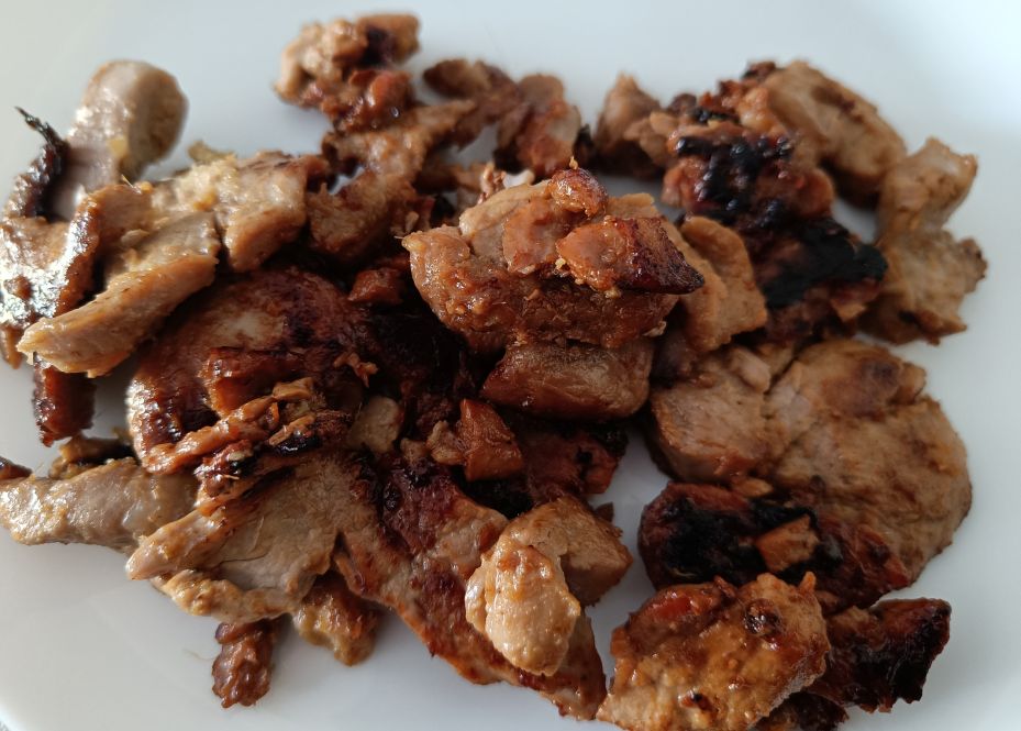 • Si la pieza de cerdo está entera, la cortamos al gusto. Yo lo hice en filetes de medio centímetro aproximadamente.