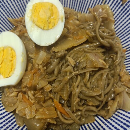 - Una vez los fideos estén hechos, servimos en los boles o platos y servimos con los huevos cocidos partidos por la mitad o como más os gusten.
